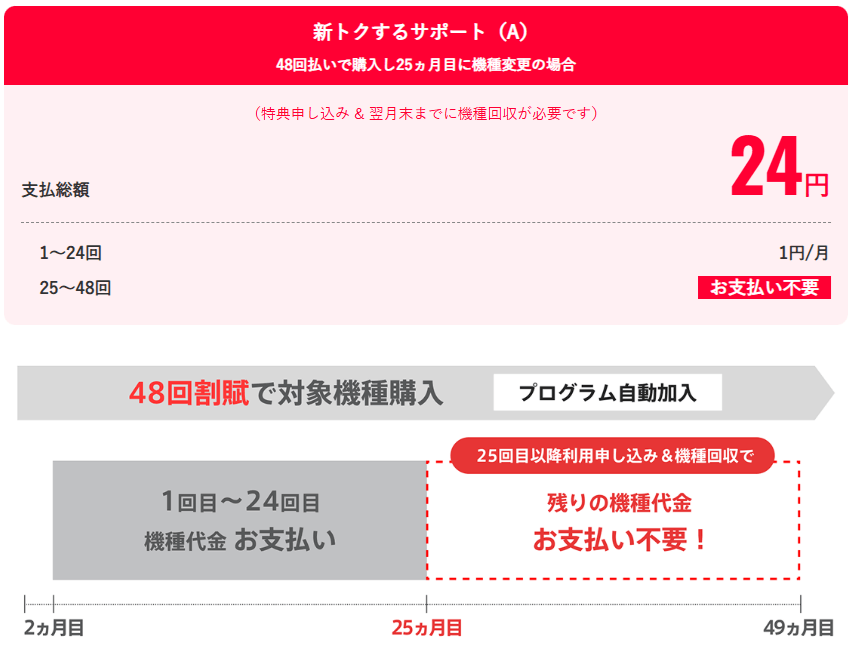 - ◆ 「新トクするサポート(A)」という48回払い+2年返却の公式プログラムを利用します。